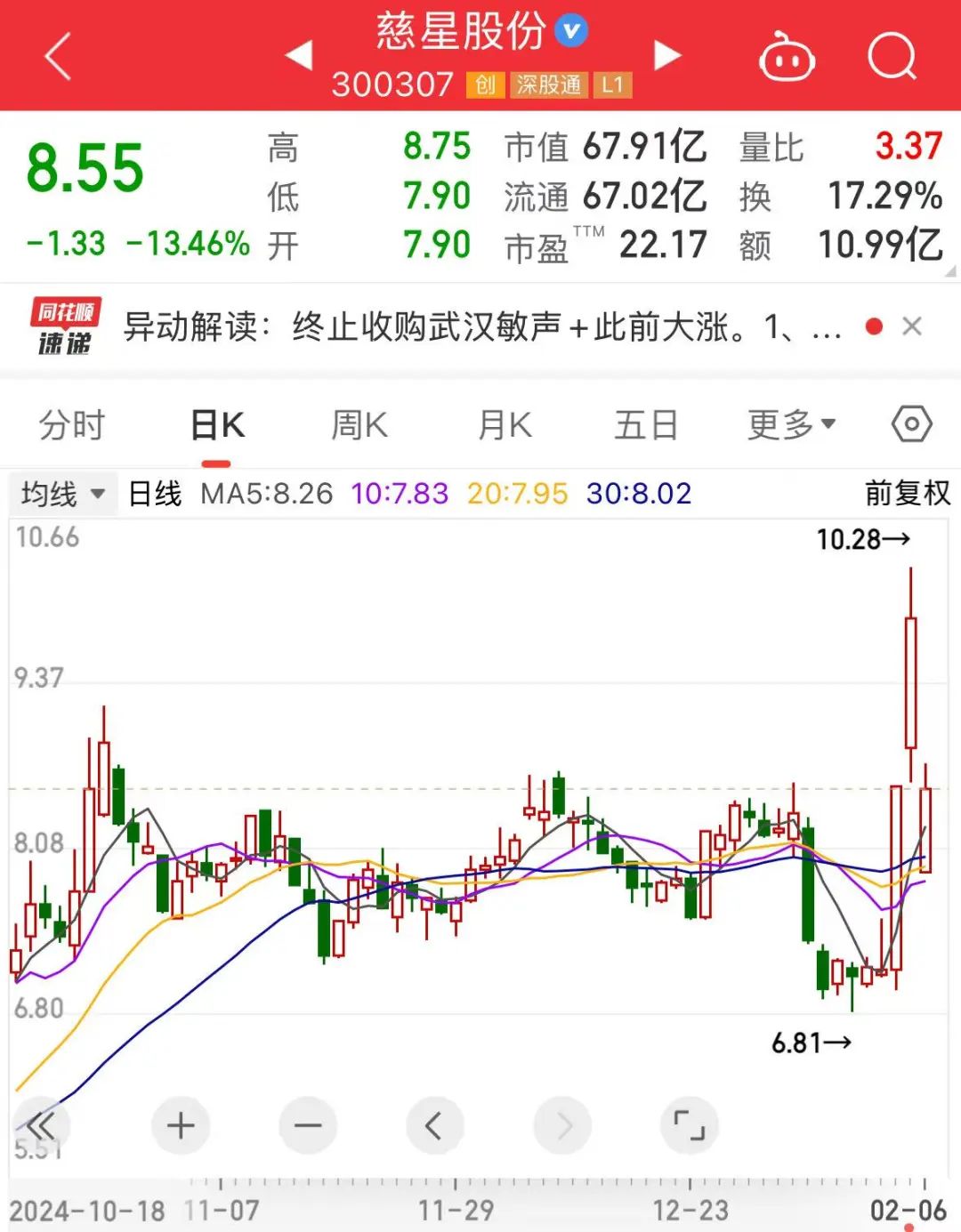 在此消息影响下,早盘慈星股份开盘“20cm”跌停,随后跌幅收窄。截至上午收盘,该股报8.55元/股,下跌13.46%。