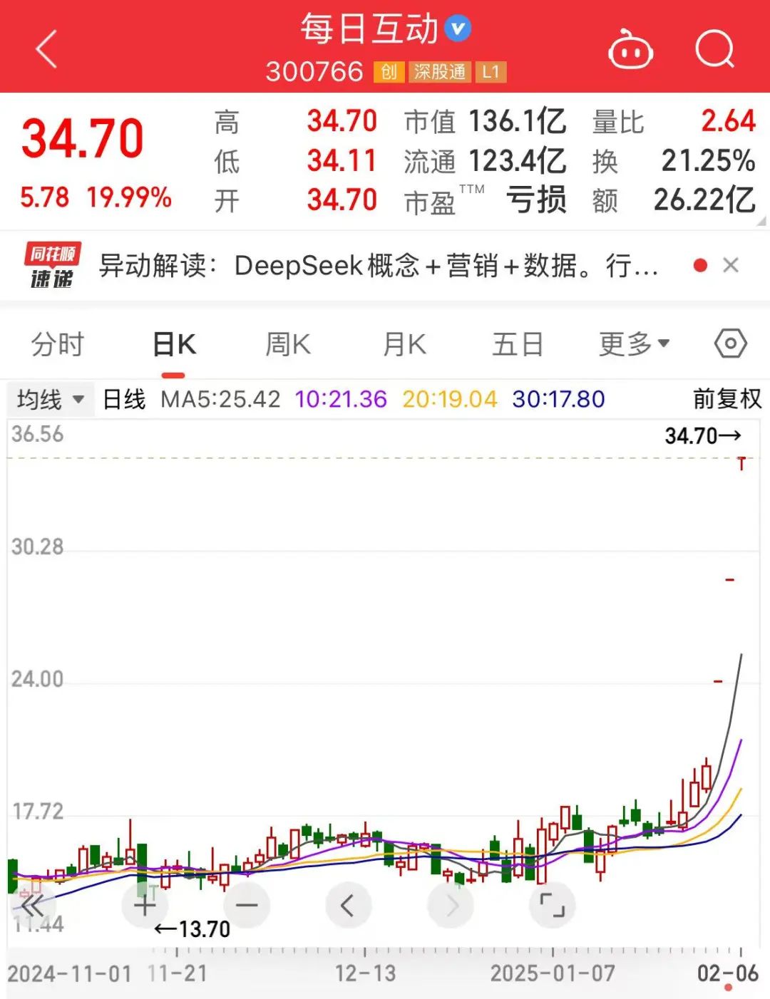 每日互动飙涨主要是因为DeepSeek概念所致,不过公司发布公告,经公司核实,深度求索的关联公司——浙江九章资产管理有限公司(曾用名:杭州幻方科技有限公司,以下简称“幻方科技”)的一位重要股东确实曾为每日互动创始核心骨干成员;但截至公告披露日,每日互动未持有深度求索和幻方科技的股权,也尚未向DeepSeek提供语料数据。公司依托DeepSeek大模型打造的数智产品对未来经营业绩等影响取决于产品研发以及行业场景落地进度,具有不确定性。