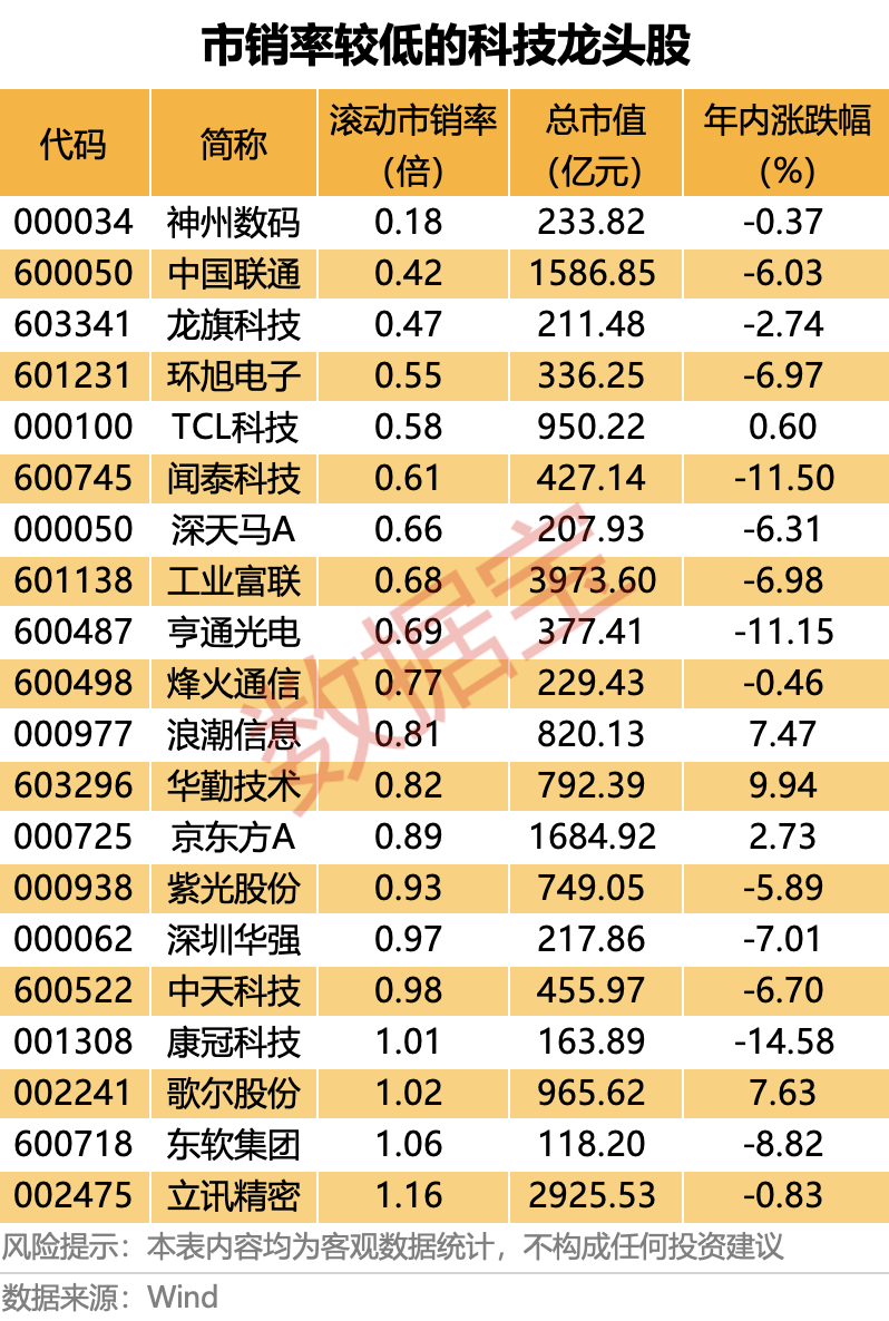 从滚动市销率方面,神州数码最低,不足0.2倍;此外,中国联通、龙旗科技、环旭电子等均不足0.6倍。