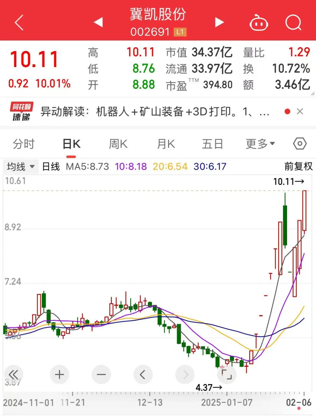 除了每日互动,冀凯股份年初至昨日收盘已大涨近82%,算上今日早盘涨幅累计上涨99.8%,有望成为年内第二只翻倍牛股。该股大涨主要是因为机器人概念。