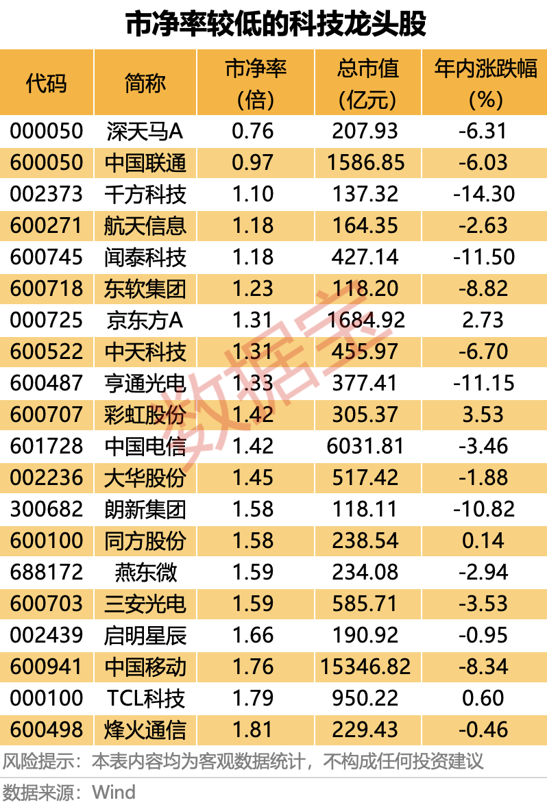 从市净率角度来看,深天马A、中国联通市净率低于1倍,千方科技、航天信息、闻泰科技等个股市净率均不足1.2倍。