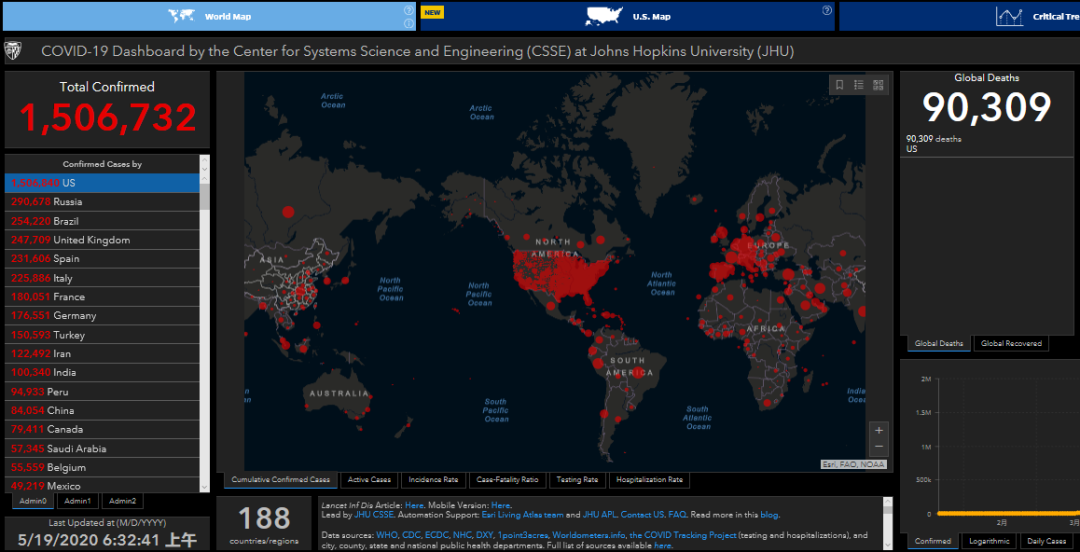 美国约翰斯·霍普金斯大学发布的实时统计数据显示,截至北京时间5月19日6时32分,美国累计确诊新冠肺炎病例1506732例,累计死亡90209例。
