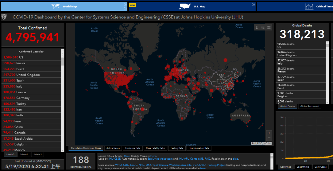 美国约翰斯·霍普金斯大学发布的实时统计数据显示,截至北京时间5月19日6时32分,全球累计确诊新冠肺炎病例4795941例,累计死亡318213例。
