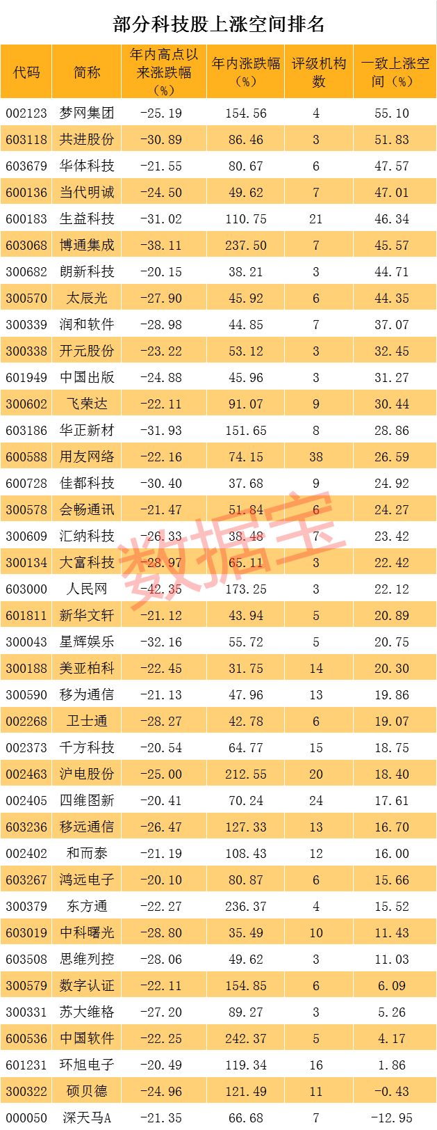 在经过一轮回调之后,生益科技的上涨空间变得可观起来。数据显示,21家机构给与生益科技的一致目标价为30.26元,较现价有46.34%的上涨空间。其他个股方面,梦网集团和共进股份一致目标价上涨空间均超过50%,华体科技、当代明诚、博通集成等个股上涨空间均超过40%。