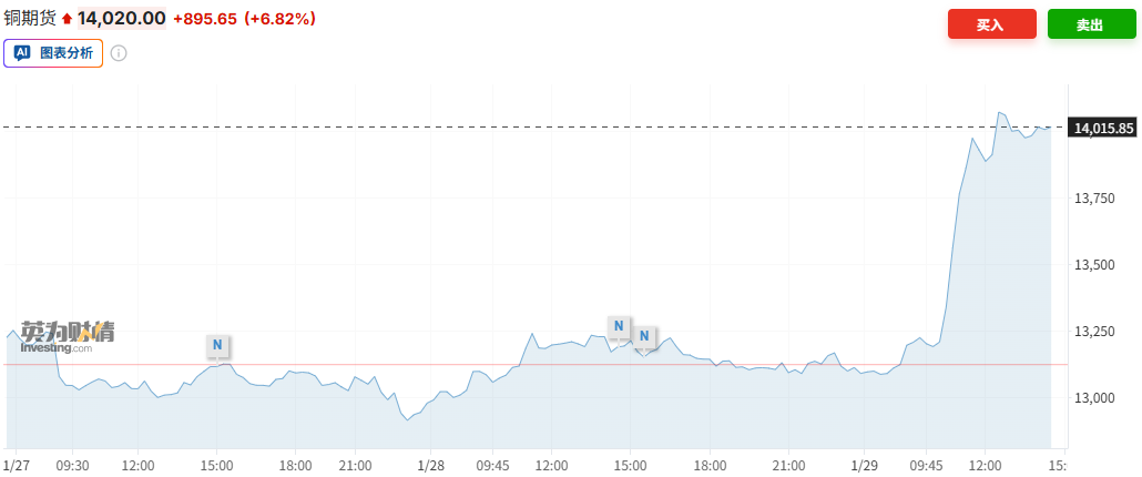 受美国经济增长走强以及全球在数据中心、机器人和电力基础设施领域支出增加的预期提振,基本金属价格在2026年开局强劲,铜价也因此创下历史新高。受多头新一轮激烈投机交易的推动,铜价录得多年来最大单日涨幅,突破每吨 14000 美元的历史新高。其他五种主要金属价格也均上涨,其中铝价接近四年高位,锌价上涨近3%。
