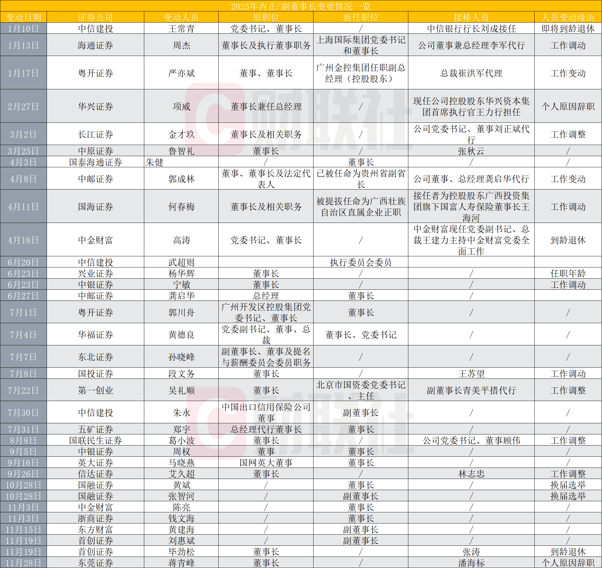 回顾2025年以来,则已有33位券商正/副董事长、28位券商总经理/总裁发生变动。