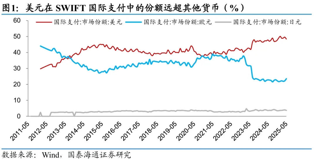 法币稳定币相当于把法定货币放在了互联网上,甚至部分跨越了现有货币体系的“国界”限制,可能会存在“赢家通吃”现象,即法币稳定币的接受度可能与法币本身的接受度高度相关。以SWIFT国际支付份额为例,美元支付份额约49%,远超欧元的24%,居于主导地位;而在当前的稳定币市场,USDT、USDC等美元稳定币占据较高比例,而欧元稳定币的市场份额占比则不到1%。