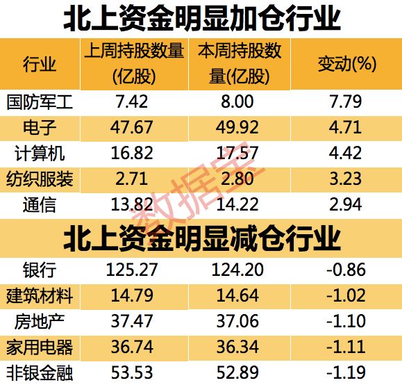证券时报·数据宝统计显示,本周北上资金持股数量环比增加行业有21个,国防军工、电子、计算机3个行业持股数量环比增加4%以上,通信行业持股数量环比增加2.94%排名第五。