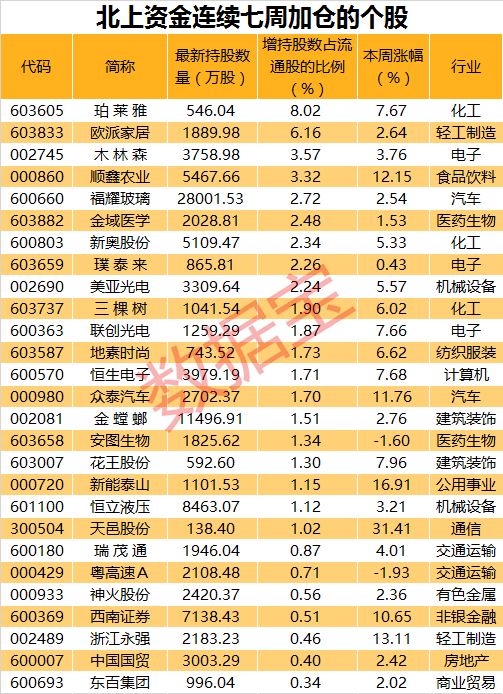 本周北上资金加仓股共753只,加仓比例超0.5个百分点的有57只。
