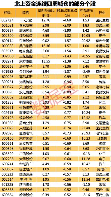 数据宝统计显示,北上资金连续四周卖出114股。分行业来看,医药生物行业个股数量最多,有13只。