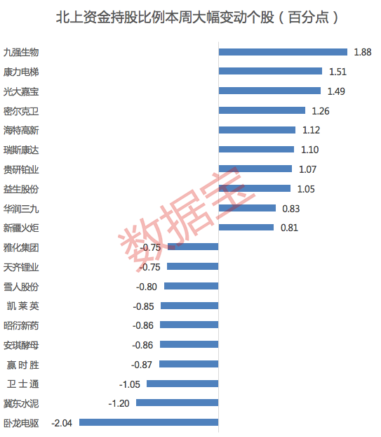 从北上资金减持股来看,卧龙电驱减仓最为明显,持股比例下降2.04个百分点;减仓幅度较大的还有冀东水泥、卫士通、赢时胜、安琪酵母等。
