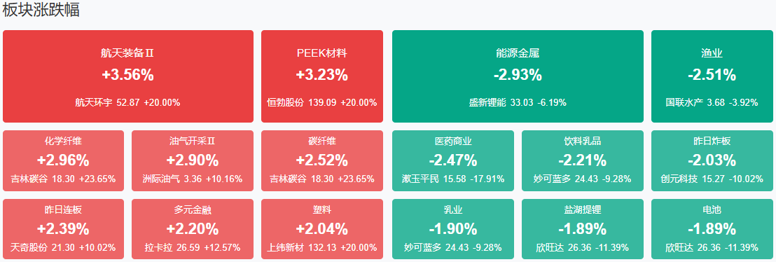 板块方面,商业航天、多元金融、人形机器人等板块涨幅居前;能源金属、渔业、医药商业、食品饮料等板块跌幅居前。截至收盘,沪指涨0.04%,深成指跌0.49%,创业板指跌0.66%。