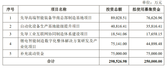 4月27日,先导智能公告,拟定增募资不超25亿元,将用于先导高端智能装备华南总部制造基地项目、自动化设备生产基地能级提升项目、先导工业互联网协同制造体系建设项目、锂电智能制造数字化整体解决方案研发及产业化项目、补充流动资金。