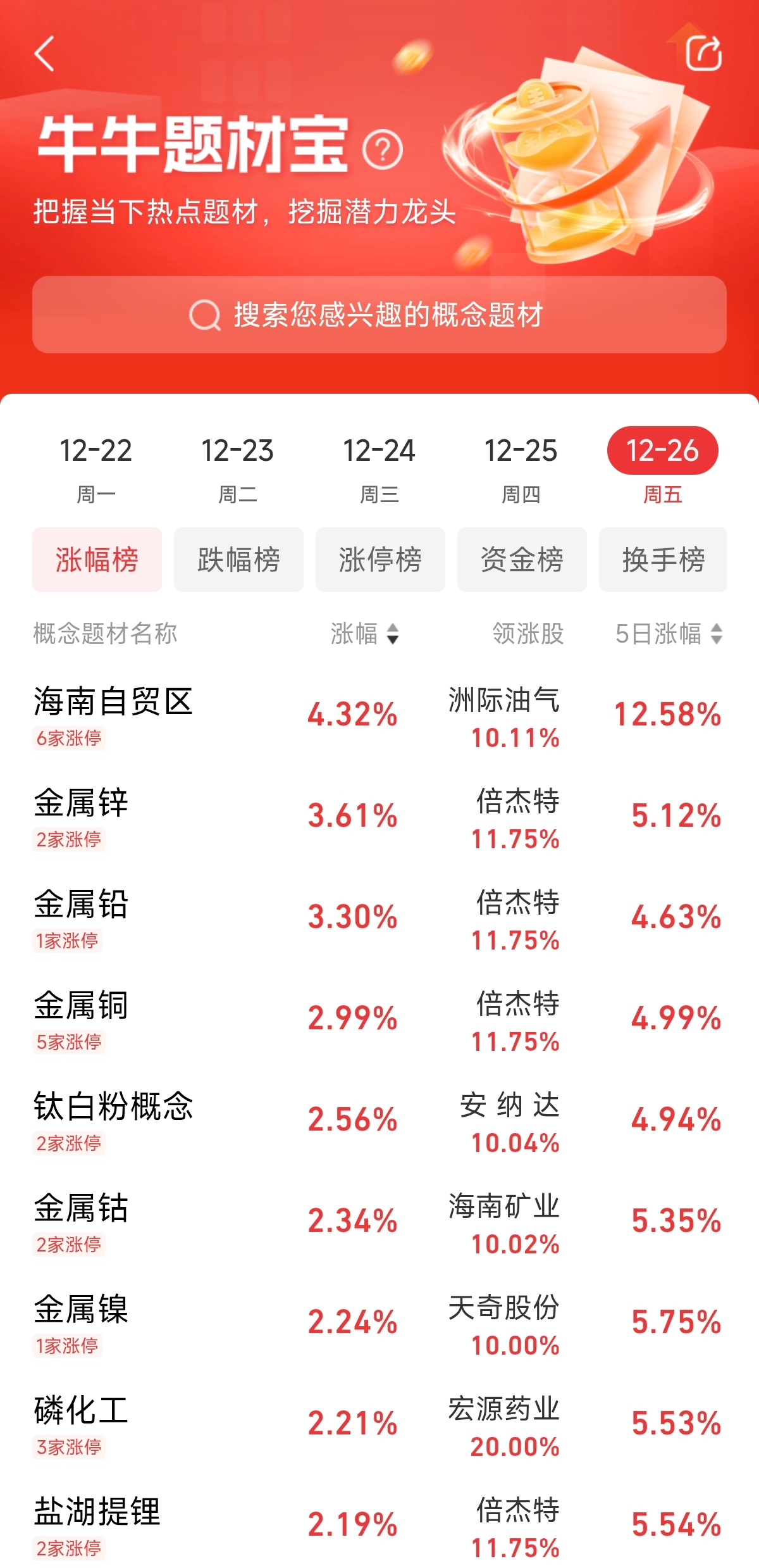 震荡行情,热点轮动快,一定要随时关注市场主线变化。如果投资人朋友没时间盯盘查资料,可以使用这个市场实时主线题材挖掘工具“题材宝”(点击解锁),会告诉你当前市场上的投资主线核心逻辑、领涨股、成分股资金流向信息。新朋友首次购买,还可以68元立减50,首月仅需18元,活动仅剩最后一周,点击查看详情>>