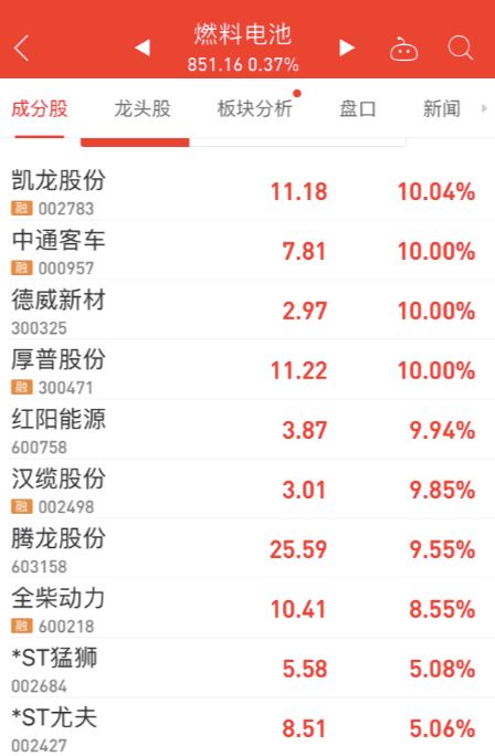 周二,燃料电池概念股大幅拉升。截至收盘,凯龙股份、中通客车、德威新财、厚普股份等多股涨停,美锦能源、全柴动力、京城股份等涨幅不俗。