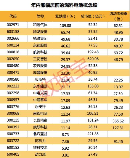 其次为腾龙股份,涨幅为65.74%。早在去年6月19日,腾龙股份发布公告称,公司与上海特玺投资合伙企业(有限合伙)签订了《股份转让协议》,公司以人民币2200万元收购上海特玺持有的新源动力股份有限公司3.57%的股份。新源动力是国家燃料电池技术标准制定的副主任委员单位、“燃料电池及氢源技术国家工程研究中心”承建单位。
