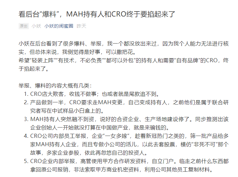 今天一篇题为《看后台“爆料”,MAH持有人和CRO终于要掐起来了》的文章在业内流传。该文来自公从号“小妖的闺蜜圈”。