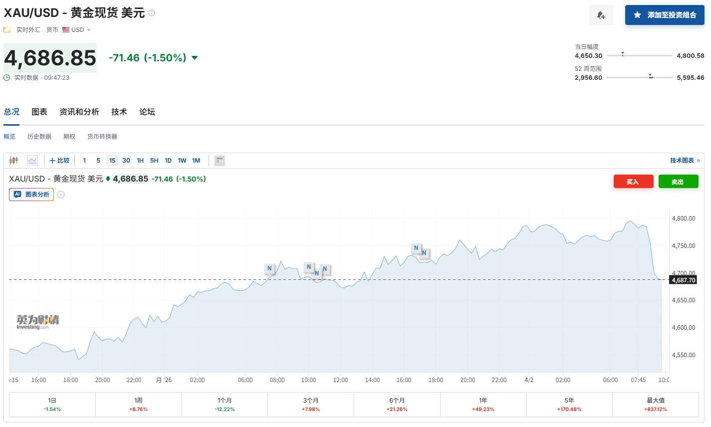 随着美国总统特朗普就伊朗问题今早发表全国讲话,黄金短线走低、震荡加剧。截至发稿,现货、期货黄金价格均徘徊在4700美元以下,此前曾一度接近4800美元。按Gilburt给出的目标价格计算,金价还将较当前水平下跌超过20%。