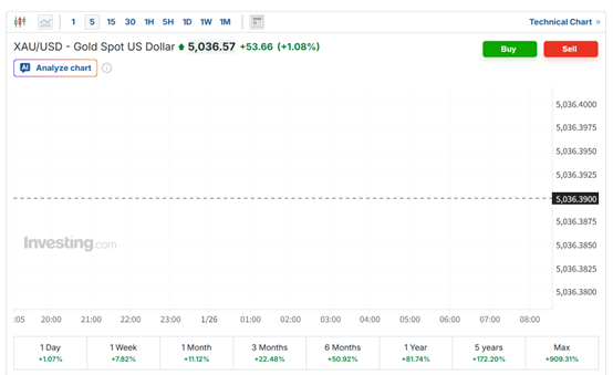 2026年开年以来,黄金延续了去年历史性的涨势,迭创新高。周一(1月26日)亚市早盘,黄金市场又一新纪录诞生:现货黄金首次突破5000美元/盎司的关键整数关口。眼下,距离现货金首次突破4000美元关口仅过去100余日。