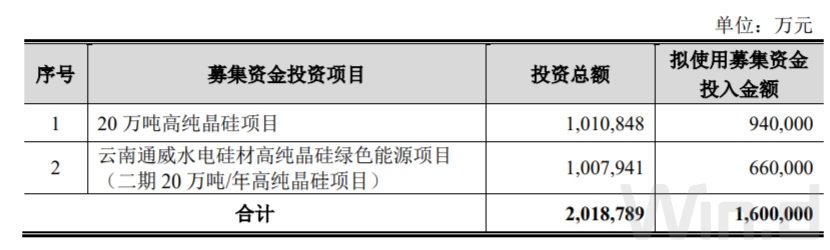 与此同时,通威股份左手发出近130亿,右手又计划拿进160亿元。根据定增募资预案,通威股份拟募资160亿元,为上市以来最大规模募资,募资将全部用于20万吨高纯晶硅项目、云南通威水电硅材高纯晶硅绿色能源项目(二期20万吨/年高纯晶硅项目),分别拟投入募资94亿元、66亿元,项目总投资预计为201.88亿元。