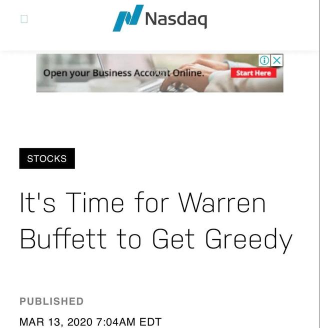 纳斯达克官网转发文章:“现在正是巴菲特贪婪的时候”