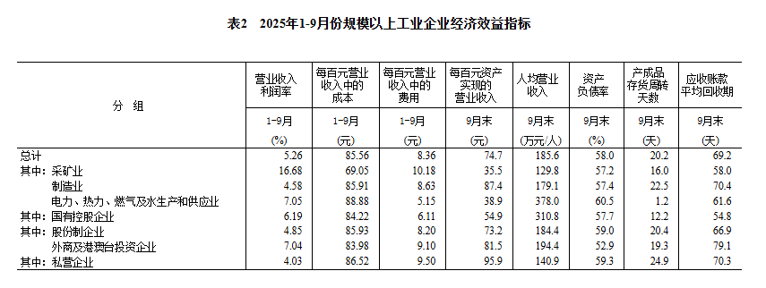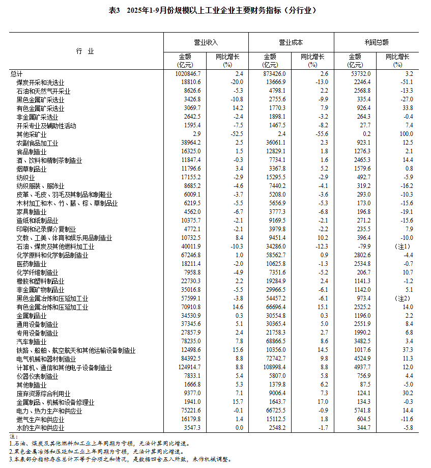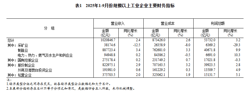 2025年1—9月份全国规模以上工业企业利润增长3.2%