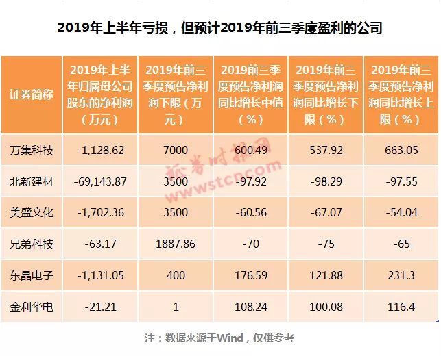 一些公司2019年上半年亏损,但预计前三季度净利润为正值,这意味预计第三季度单季经营情况好转,此类公司目前也有数家。