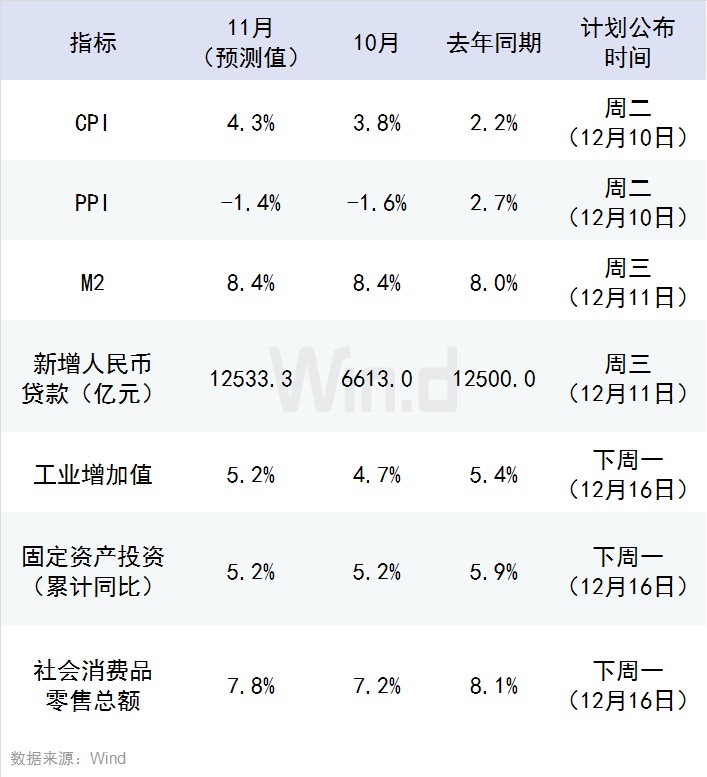 从目前机构预测的情况来看,CPI预计继续上行,“破4”概率较大,受双十一提振,消费可能强势回升,信贷和社融数据或有所改善。