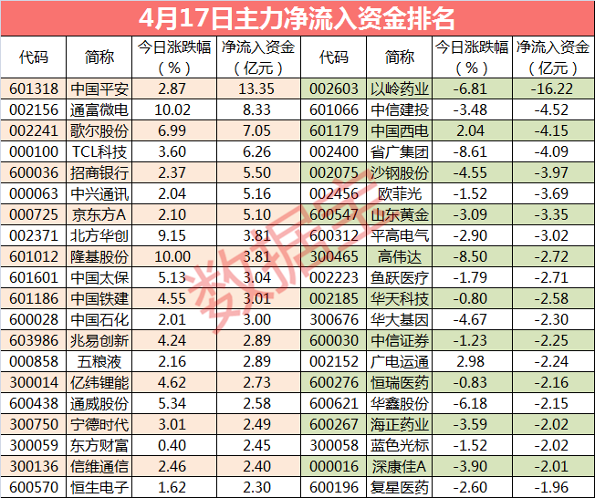 个股来看,共有59只个股主力资金净流入超亿元,中国平安主力资金净流入13.35亿元,净流入资金居首;通富微电歌尔股份紧随其后,全天净流入资金分别为8.33亿元、7.05亿元;全天净流入资金较多的还有TCL科技招商银行等。股价表现方面,净流入资金超亿元个股今日平均上涨4.64%,表现强于大盘,涨停的有芯能科技通富微电酒鬼酒等。