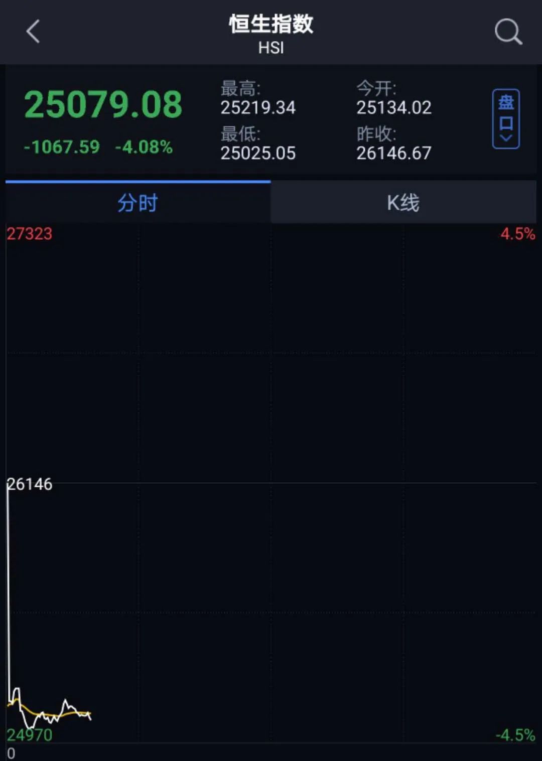 恒指今日大幅低开逾一千点!跌幅3.87%,报25134.02点,创下自去年8月以来新低。