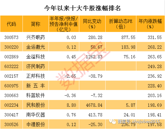 经过一段时间的调整,上证指数已跌回2800点下方,全年涨幅仅12%。不过,仍有一大批牛股存在。剔除今年上市的次新股后,年内涨幅超过200%的个股合计有7只,分别是兴齐眼药、金运激光、金溢科技等。其中,兴齐眼药年内大涨332%,位居涨幅榜首位;金运激光年内大涨268%位居次席,金溢科技大涨264%位居第三位。