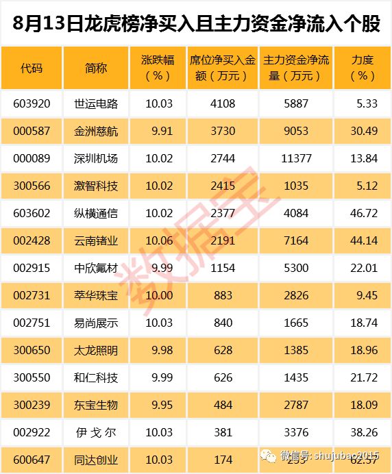 8月13日龙虎榜中机构及营业部席位资金净买入0.76亿元,其中净买入的个股有15只;净卖出的个股有9只。净买入前三名个股分别是世运电路、金洲慈航、深圳机场等,净买入金额占当日成交额比例达3.72%、12.56%、3.34%。