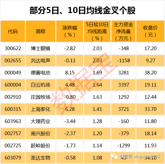 目前有45只A股的5日均线主动上穿10日均线,其中博士眼镜、共达电声、德赛电池等个股的5日均线较10日均线距离最大,分别达2.03%、2.03%、1.69%。