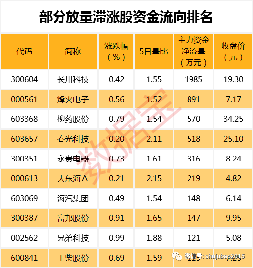 值得注意的是,24只放量滞涨股中,长川科技、烽火电子、柳药股份、春光科技、永贵电器等个股主力资金净流入较多。