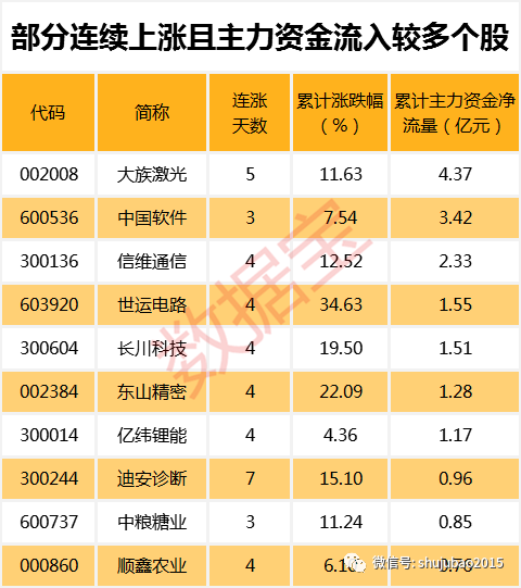 值得注意的是,150只连续上涨个股中,7只个股期间主力资金累计净流入超过亿元。其中,累计资金流入最多的为大族激光,主力资金累计流入4.37亿元。