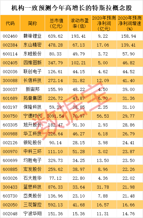 证券时报·数据宝根据5家以上机构一致预测数据,绝大部分特斯拉概念股今年业绩有望持续高增长。