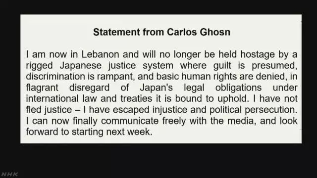 12月31日,戈恩通过在纽约的代理人发布声明,确认已抵达贝鲁特。他解释自己并非逃避法律制裁,而是“逃离日本的司法不公及政治迫害”。