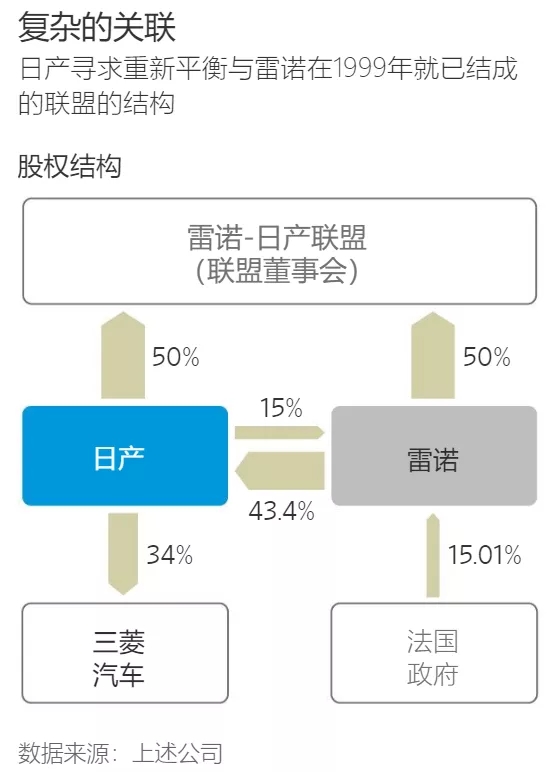 日产汽车虽然销量更高,但在联盟关系中的话语权较低。雷诺拥有日产汽车43.4%的股份——通过1999年后者陷入困境时达成的一项救助协议获得。日产汽车则持有雷诺15%的无投票权股份。