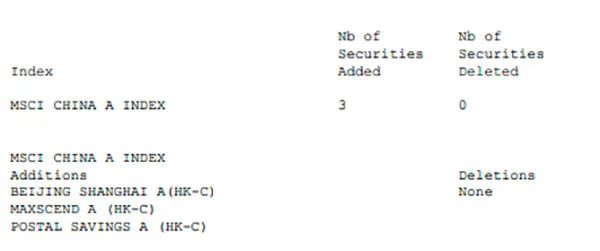 MSCI 中国 A 股指数新增京沪高铁、邮储银行、卓胜微3只A股标的,无剔除标的。