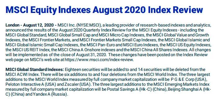 北京时间8月13日晨,国际指数编制公司MSCI宣布了8月份季度指数评审结果。