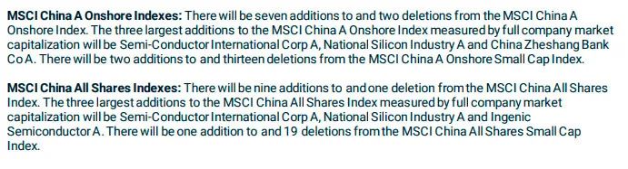除全球指数系列外,MSCI 中国全股票指数以及 MSCI 中国 A 股在岸指数的成分股名单也有所调整,不过,跟踪上述两只指数的海外资金相对较少,调整或不会带来显著的资金进出。