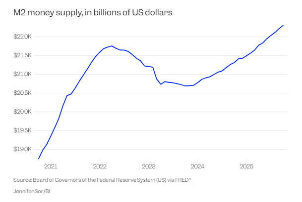 长期以来,汉克一直认为货币供应是通胀的关键驱动因素,他还提到了近期M2货币供应的增长。这是衡量经济中现金流动的一个指标,根据美联储的数据,过去五年里,M2货币供应量增加了3.5万亿美元。