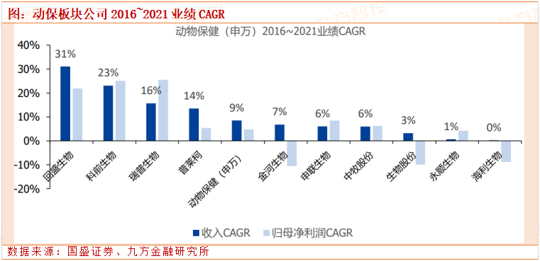 公司为 A 股唯一纯正兽用化药标的,受益于饲料端禁抗政策、限抗相关政策、新版 GMP 提升行业准入门槛,以及下游规模养殖占比提升等 多重行业因素共同催化,叠加公司核心产品泰万菌素作为新一代大环内酯类兽用专用抗 生素仍处于行业渗透率提升阶段,销售持续高增长。2016~2021 年公司总营收CAGR 31%,归母净利润 CAGR 22%,成长性领先行业,市占率持续提升。