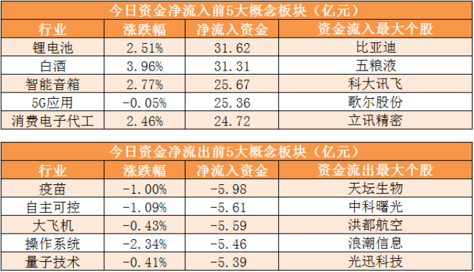 概念板块方面,今日锂电池、白酒、智能音箱等概念板块资金呈现净流入,其中锂电池概念净流入31.62亿元居首。
