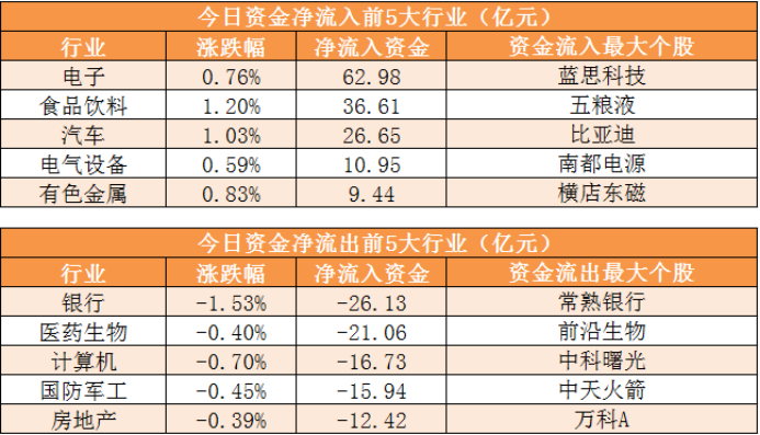 28个申万一级行业中,10个行业实现资金净流入,其中电子行业净流入62.98亿元居首。