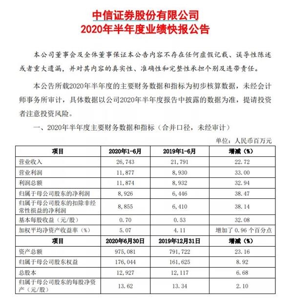 7月29日晚间,中信证券发布2020年半年度业绩快报,披露今年上半年的主要财务数据指标。数据显示,2020年上半年,中信证券实现营业收入267.43亿元,同比增长22.72%;实现归母净利润89.26亿元,同比增长38.47%。对于业绩增长情况,中信证券轻描淡写地形容为“2020年上半年,公司各项主营业务均实现增长,资产质量及经营业绩保持良好”。