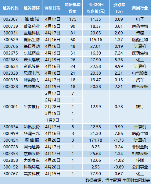 恒生聚源数据显示,截止2020年4月20日,沪深两市共有20家上市公司公布机构调研情况,共接受619家机构调研。