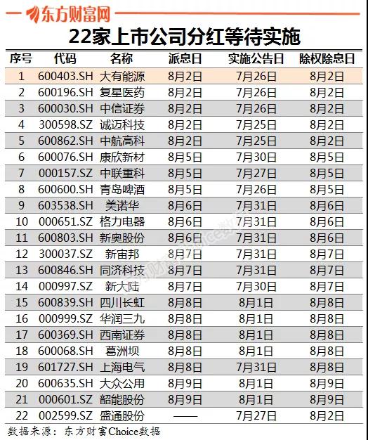 据统计,沪深两市共2485家上市公司在2018年年报中披露分红预案。截至8月1日收盘,2463家上市公司已经实施完毕,尚有22家等待实施(含股权登记当天)。