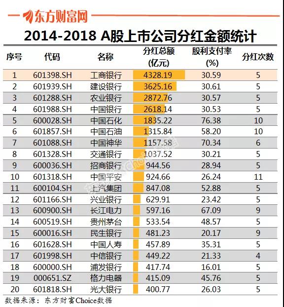 从分红金额看,过去5年分红总额前20中,大部分为银行股,其中6家为股份制与城商行,5家为国有银行。总体看来,工商银行分红总额居首,高达4328.19亿元,其次为建设银行,累计分红达到3625.16亿元。农业银行累计分红2872.76亿元,位列第三。