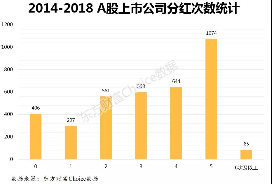 目前A股市场上共3665只股票,其中88.92%股票在过去5年中进行了分红,有406只股票从未进行分红。统计发现,大部分上市公司平均每年分红一次,而中国平安分红次数最多,达到了11次,其次为中国石油、广汽集团、中国石化、潍柴动力,过去5年分红次数均为10次。